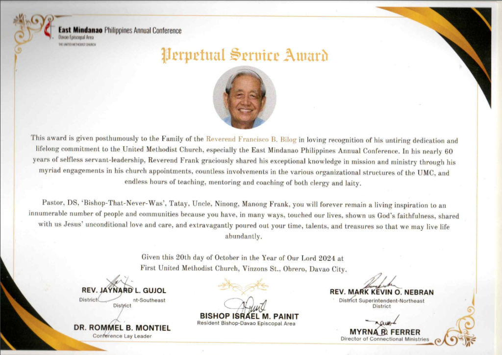 Frank has died. I've known him since my daughter, Scarlett and I made our first trip to Spottswood Center in 2001. I've preached in his church and he preached in First UMC in Texarkana, Texas USA. We together brought mission teams from the Texas Annual Conference to churches in Mindanao. Mrs. Bilog and another lady even took me shopping in Davao City. Frank was truly a faithful servant of Jesus Christ and a great leader in the United Methodist Church of the Philippines and the entire United Methodist Church. "Well-done thou good and faithful servant." I will pray for you, Mrs. Bilog and for your family, I am so sorry for your loss.